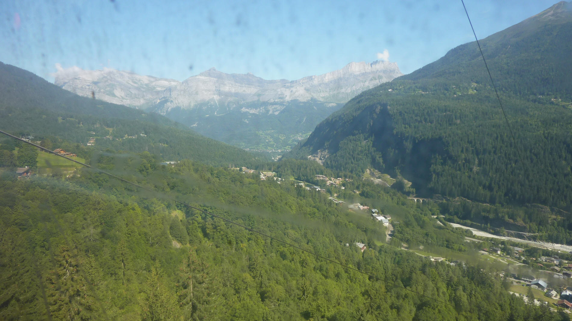 départ des Houches vers Bellevue (1801m), au loin la Chaîne des Fiz avec l'Aiguille du Varan(2144m), la Pointe de Chardonnet 3824m)..