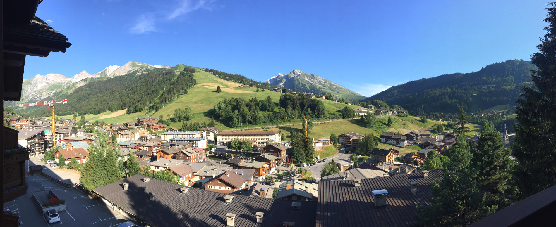 la Clusaz (1040m) (maj : 15/07/2018) de droite à gauche: Le Plateau de Beauregard (1690m), la Pte du Mercdassier 2313m, les crêts du Merle et du Loup, l'Aiguille des Calvaires (2322m)