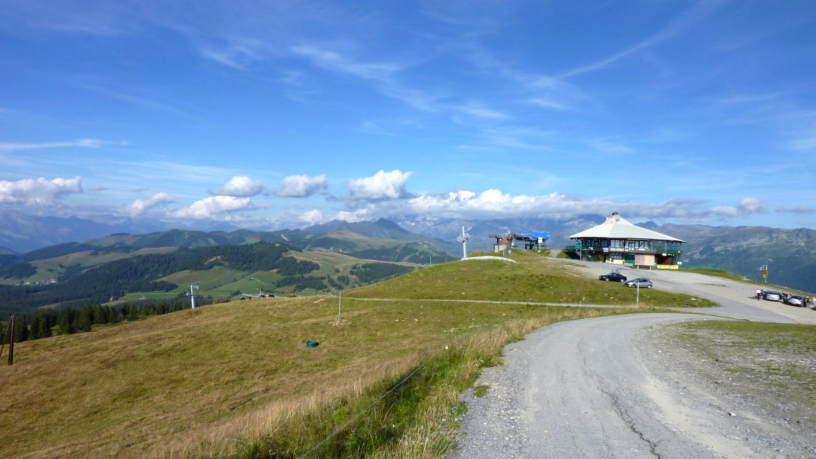 panorama ''est'' du col de Bisanne (1950m) le 4 septembre 2010, le restaurant panoramique, au loin, dans les nuages,... le Mont Blanc
