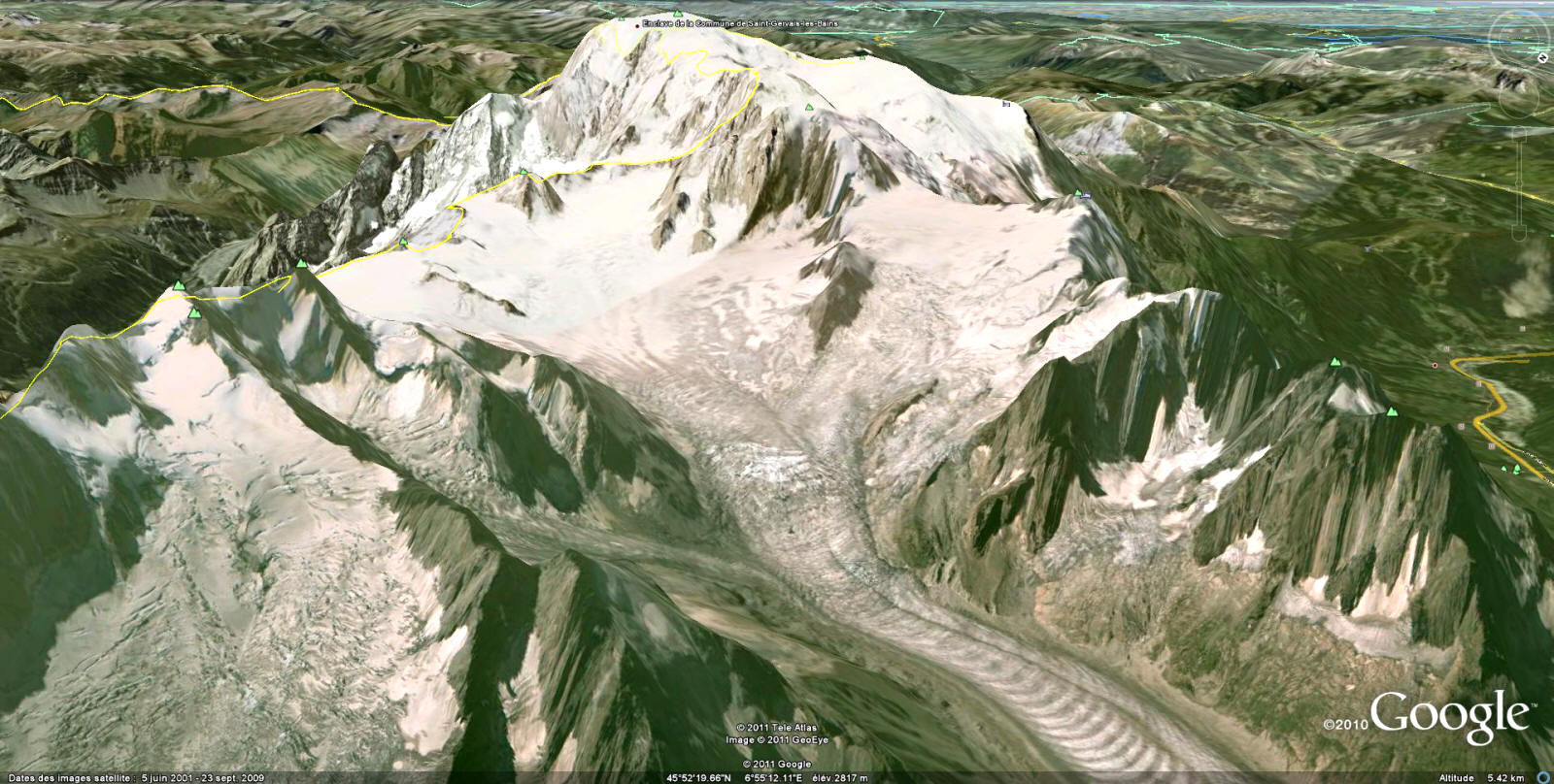 la Pointe d'Helbronner (3462m) - le Glacier du Géant - le Mont Blanc (4810m) - la Vallée Blanche - le Pic du Midi (3842m) - la Mer de Glace
