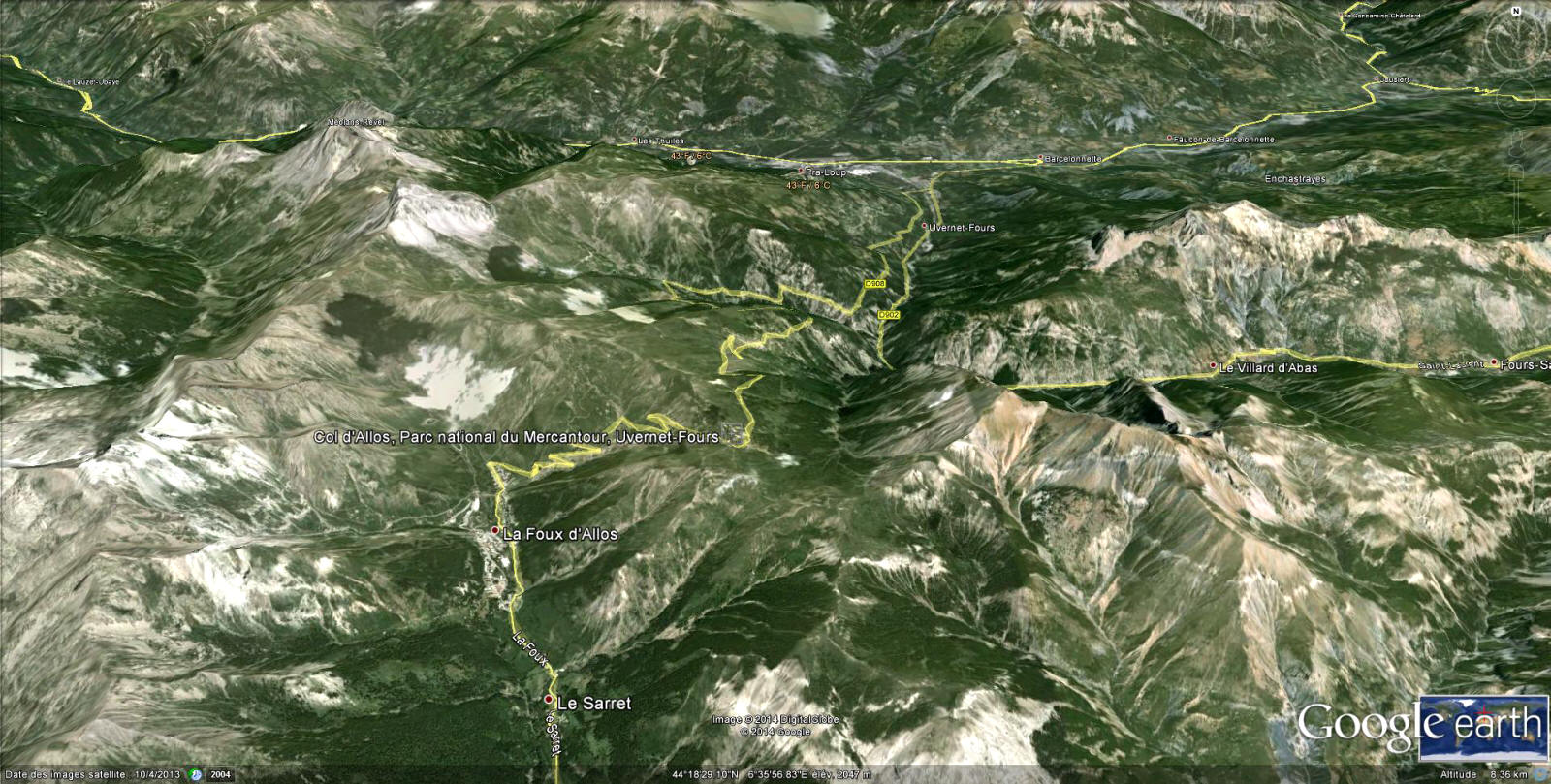 col de d'allos       Barcelonnette  - le col d'Allos - le Haut Verdon - les Gorges du Bachelard - le col de Cayolle - Le Parc National du Mercantour  (copyright Google Earth)