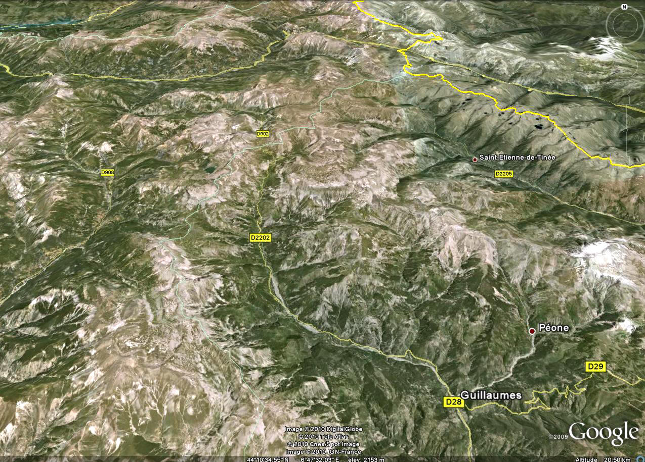 Bachelard - le col de Cayolle - Le Parc National du Mercantour les cols de Restefond et de la Bonette - la Vallée de la Tinée (copyright Google Earth) |