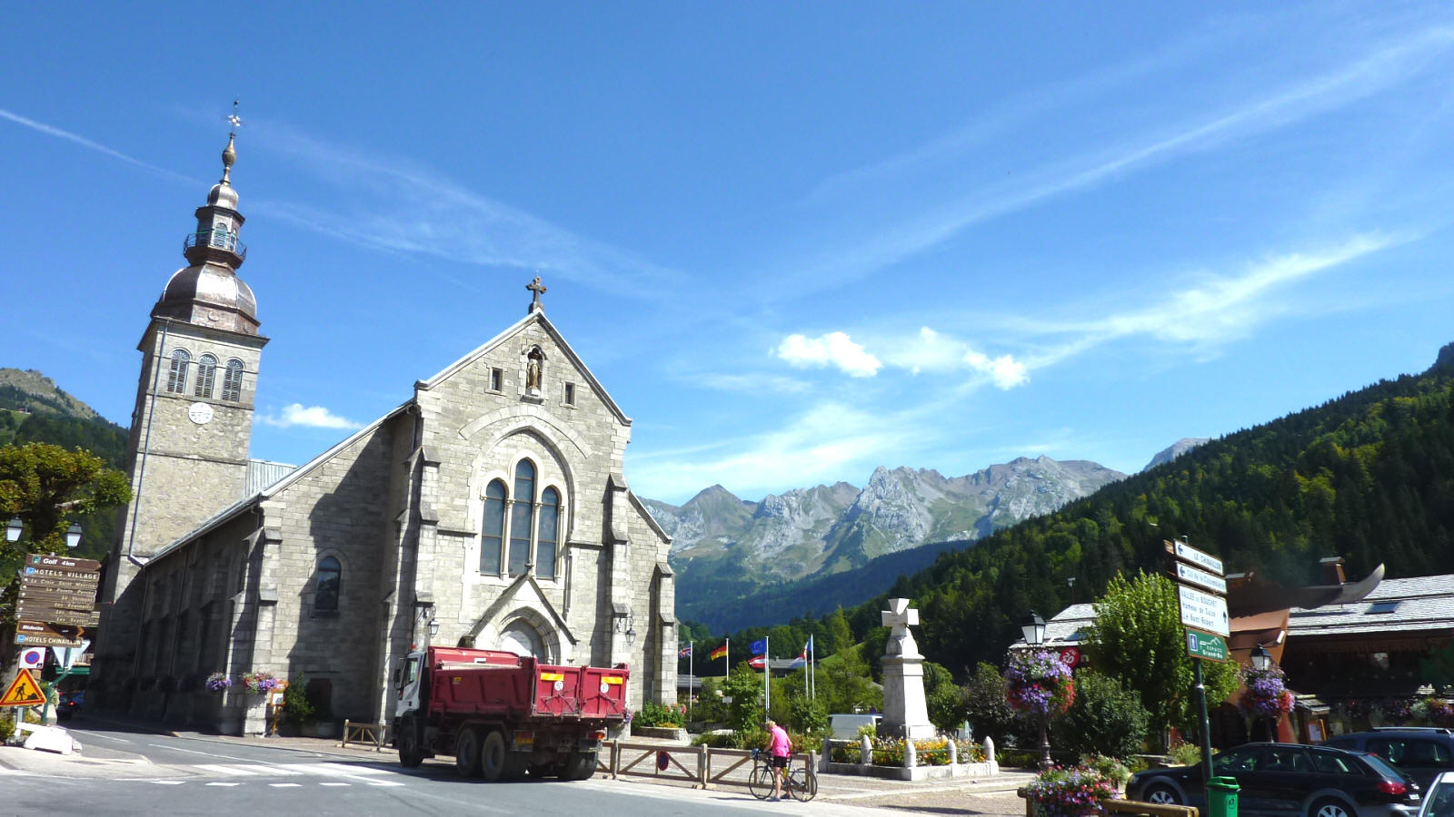 l'église du Grand Bornand (1300m), au loin la Chaîne des Aravis - 30/08/2011