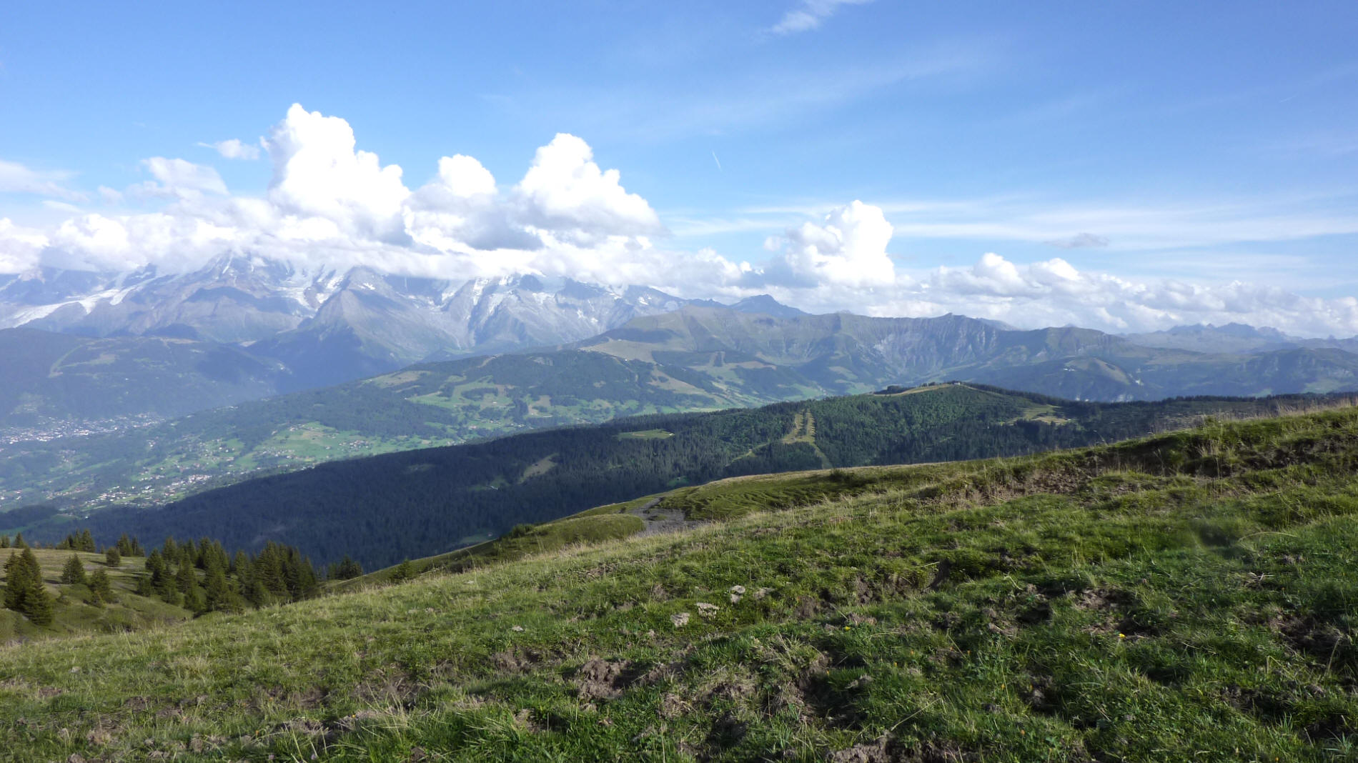 vue de la cabane du Petit Pâtre (1915m)..on aperçoit le Mont d'Arbois (1830m), le Mont Joux 1958m), le Mont Gréoux (2288m), le Mont Joly (2525m), les Têtes de Véleray (2452m) et de la Combaz (2445m)....