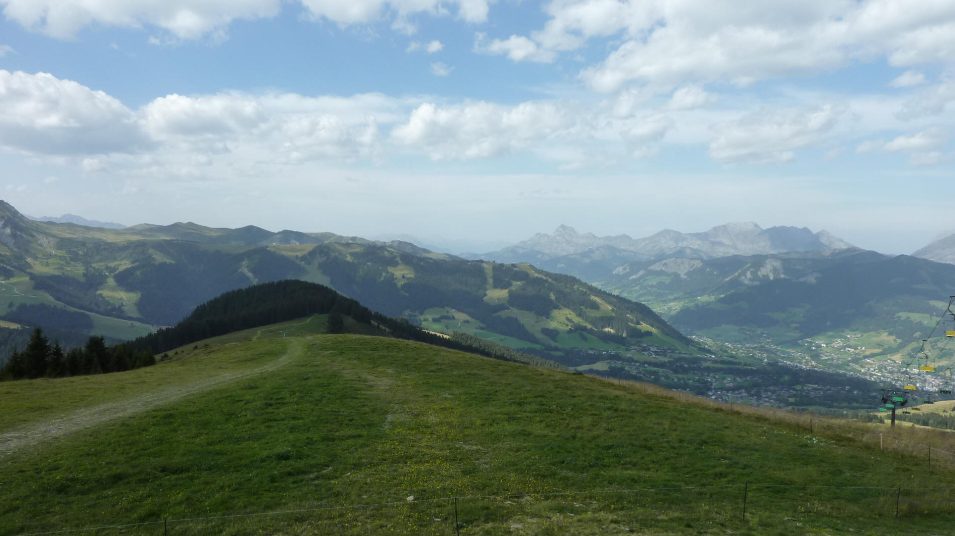 l'Alpette (1871m), la Rochebrune (1754m), au fond de la vallée Megève et au loin la Chaîne des Aravis