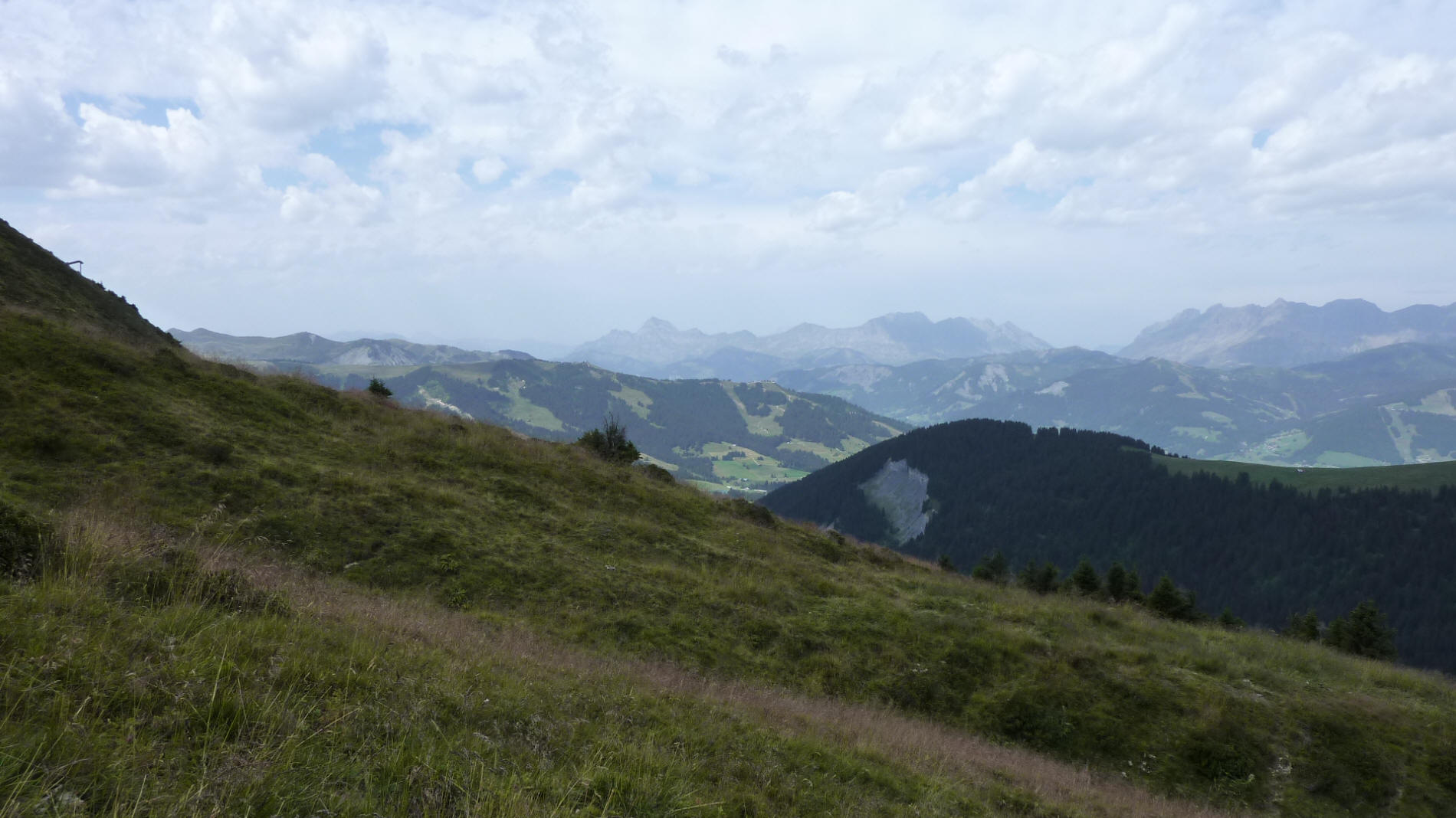 vue du Mont Gréoux (2288m), l'Alpette (1871m), la Rochebrune (1754m), au fond de la vallée Megève, au delà le Christomet (1853m), le Jaillet (1580m), au loin la Chaîne des Aravis