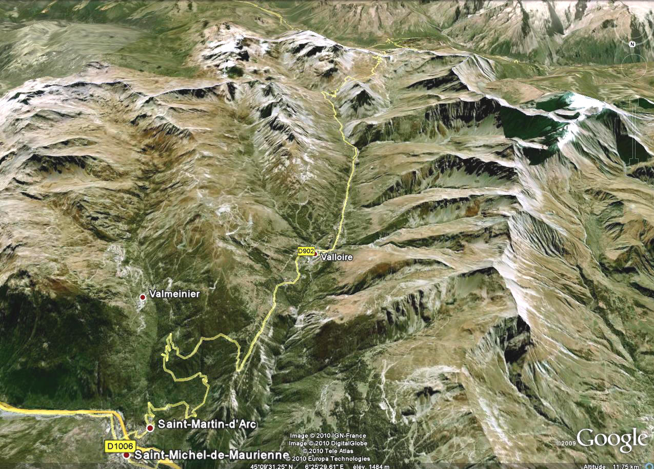 valloire                           le Col du Télégraphe (1570m) - Valloire - le Col du Galibier (2642m) - Col du Lautaret (2058m)          (copyright Google Earth)